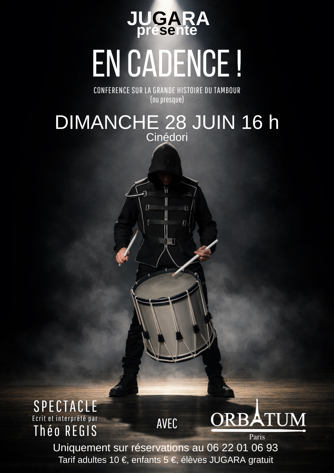 🎶 Un spectacle de l’ensemble de tambours Orbatum🎶 Pour ses 20 ans l'école de batterie JUGARA reçoit, en 2ème partie, un groupe de tambours professionnels, composé de musiciens virtuoses issus des plus grands orchestres comme la Garde Républicaine ! Cet ensemble de percussionnistes ORBATUM vous présentera à cette occasion son nouveau spectacle 🥁 EN CADENCE ! Une conférence spectacle autour du tambour, entre héritage et création contemporaine. À travers une approche à la fois pédagogique, scénique et musicale, ce spectacle explore l’évolution du tambour, de ses usages historiques à ses formes les plus modernes. Rythmes, lumières, mouvements chorégraphiés, le tambour devient ici un instrument total, au croisement de la tradition et du spectacle vivant🎭 En première partie l'école de batterie JUGARA vous proposera un mini concert où le rock, la variété internationale, le pop-rock, le métal, le jazz, la fusion seront mis à l'honneur par une trentaine d'élèves batteurs. Bien plus qu'un concert, un véritable spectacle. Entrées uniquement sur réservations au 06 22 01 06 93. Tarif adultes 10 €, enfants 5 €, élèves JUGARA gratuit